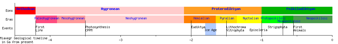 200 millions years later, a drop in sunlight, due to a change in Miavegr orbit, provoked a global ice age. This cold period, with ice sheets covering most of Miavegr surface lasted for the next 100 million years. Only a small part of the great diversity of unicellulars survived this event, mainly: Eudiktya, Anthrachroma, Kalkapria and Subpauperia. The Anthrachroma adapted to live under the thick ice sheet and derived their energy from photosynthesis. They evolved to use what little of the light that came under the ice, absorbing even most infrared. The Kalkapria formed dense biofilm and calcareous structures near thermal seeps. The Subpauperia adapted to live in anoxic sediments in the deep ocean, they evolved a large diversity of metabolisms and some retained photosynthetic capabilities. The Eudiktya present during these times mostly fed on Anthrachroma biofilms under the ice sheet.