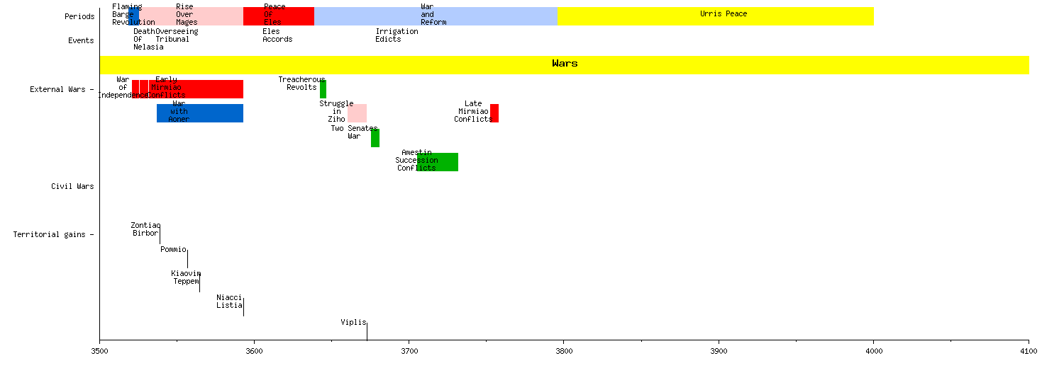 This last war was extremely costly for the republic and highly unpopular. The military decisions were, at that time, made by the Rivers Senate because it functionally held executive power. The Lands Senate wanted a place in these decisions, however this was refused. This argument degenerated in a civil war, when the Overseeing Tribunal ruled in favor of Nirta in 3675. Two Generals supported Nirta, two supported Miaolti and two stayed neutral, the admiral of the River Fleet supported Miaolti. This allowed the Rivers Senate to enter Nirta in 3676, they burned the Lands Senate. However their armies couldn't take control of the city. They had to withdraw from the city. In the following years the civil war expanded to most of the republic. With popular militias supported by Nirta clashing with the private armies of rich merchants. The war continued until 3681 when a peace agreement was signed in Rubliei. The Lands Senate agreed to create the Bounding Assembly, in which the Lands Chancellor had a seat. This settled the conflict over executive power.