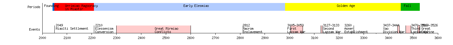 In 3471 the Second Lazzam Empire conquered Vlizia, Inzia and Kiaovim. The Elesmiao responded in 3491 but was only able to retake Kiaovim. In 3509 Elesmiao ceded Disdovila to the Aoner Magocracy in exchange for help for another campaign against the Lazzam Empire, however it was unsuccessful, the Lazzam Empire even gained some territories. The same year the Lixao Empire invaded Bliddao, the Prince's guarrison destroyed the city while fleeing. However the Elesmiao and Aoner armies pushed the Lixao back in 3511.