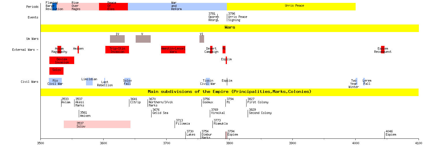 This last war was extremely costly for the republic and highly unpopular. The military decisions were, at that time, made by the Rivers Senate because it functionally held executive power. The Lands Senate wanted a place in these decisions, however this was refused. This argument degenerated in a civil war, when the Overseeing Tribunal ruled in favor of Nirta in 3675. Two Generals supported Nirta, two supported Miaolti and two stayed neutral, the admiral of the River Fleet supported Miaolti. This allowed the Rivers Senate to enter Nirta in 3676, they burned the Lands Senate. However their armies couldn't take control of the city. They had to withdraw from the city. In the following years the civil war expanded to most of the republic. With popular militias supported by Nirta clashing with the private armies of rich merchants. The war continued until 3681 when a peace agreement was signed in Rubliei. The Lands Senate agreed to create the Bounding Assembly, in which the Lands Chancellor had a seat. This settled the conflict over executive power.