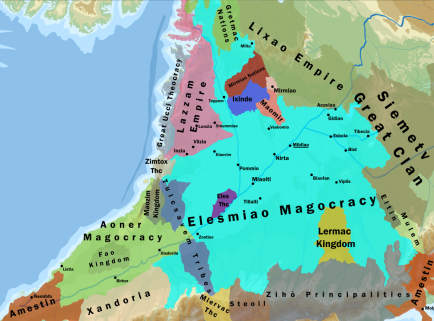 In 3221, following the civil war in the Lazzam Empire, the Elesmiao magocracy took back Teppem and Miltu. In 2253 the Archimage started a campaign against the Kingdom of Lunzia, and also conquered the neighbouring Tulc territories and Kiaovim from the Smu Duchy.