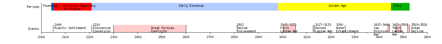 In 3471 the Second Lazzam Empire conquered Vlizia, Inzia and Kiaovim. The Elesmiao responded in 3491 but was only able to retake Kiaovim. In 3509 Elesmiao ceded Disdovila to the Aoner Magocracy in exchange for help for another campaign against the Lazzam Empire, however it was unsuccessful, the Lazzam Empire even gained some territories. The same year the Lixao Empire invaded Bliddao, the Prince's guarrison destroyed the city while fleeing. However the Elesmiao and Aoner armies pushed the Lixao back in 3511.